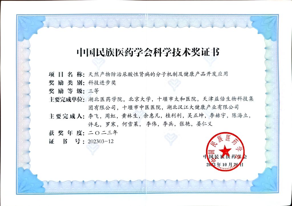 本网讯(通讯员 余惠凡)近日,中国民族医药学会发布《关于2023年度中国民族医药学会科学技术奖的奖励决定》(中民医药会科〔2023〕129号文件,公布了2023年中国民族医药学会科学技术奖评选结果,李飞教授团队主持的成果《天然产物防治尿酸性肾病的分子机制及健康产品开发应用》荣获三等奖。