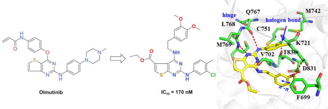本网讯(通讯员 吴丰旭)龙年之首,304am永利集团小分子创新药物与药用功能材料研究团队再添新成果。恶性肿瘤是目前威胁人类生命健康的重大疾病之一,抗肿瘤药物的研发趋势也从传统的细胞毒药物转为靶向细胞内特定信号转导的药物。以表皮生长因子受体(EGFR)为药物作用的靶点,通过干预EGFR信号传导进行肿瘤治疗已成为近年来抗肿瘤药物研发的热点。然而这类药物在实际治疗中都面临着毒副作用大,用药一段时间后易产生药物抗性等问题,因此研发具有新颖骨架且高效的靶向EGFR药物分子仍然具有重要意义。