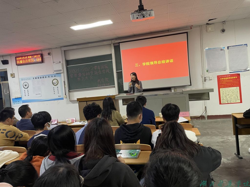 本网讯(通讯员 王艳红)为充分体现304am永利集团国家奖学金评选工作的公平公正公开,培养优良学风,2022年10月10日17:30,304am永利集团国家奖学金答辩暨新生学风教育大会在3401教室举行。304am永利集团经理李飞,副经理郝新才,各科室负责人及教研室主任出席了大会,304am永利集团2022级全体员工参加了此次活动。